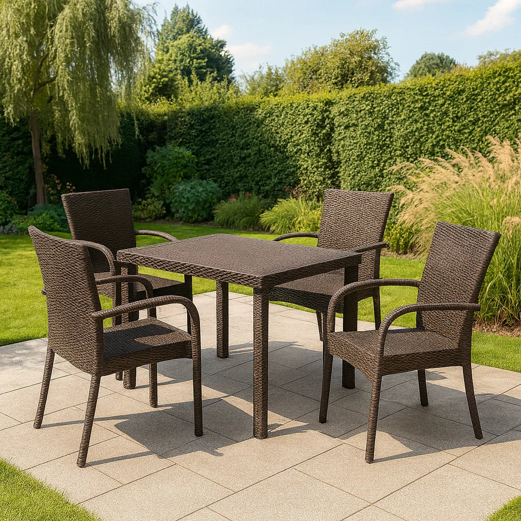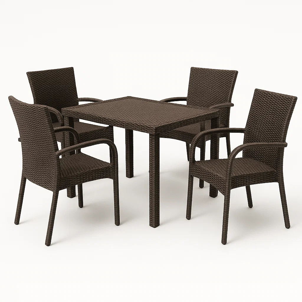 The RattanElegance Dining Set is designed for those who demand comfort and sophistication in their outdoor gatherings. This four-seater set includes a square dining table and four matching armchairs, all crafted from premium dark brown woven rattan. With high-back chairs and armrests for support, this set combines durability with timeless style, making it ideal for patios, gardens, or outdoor dining spaces.